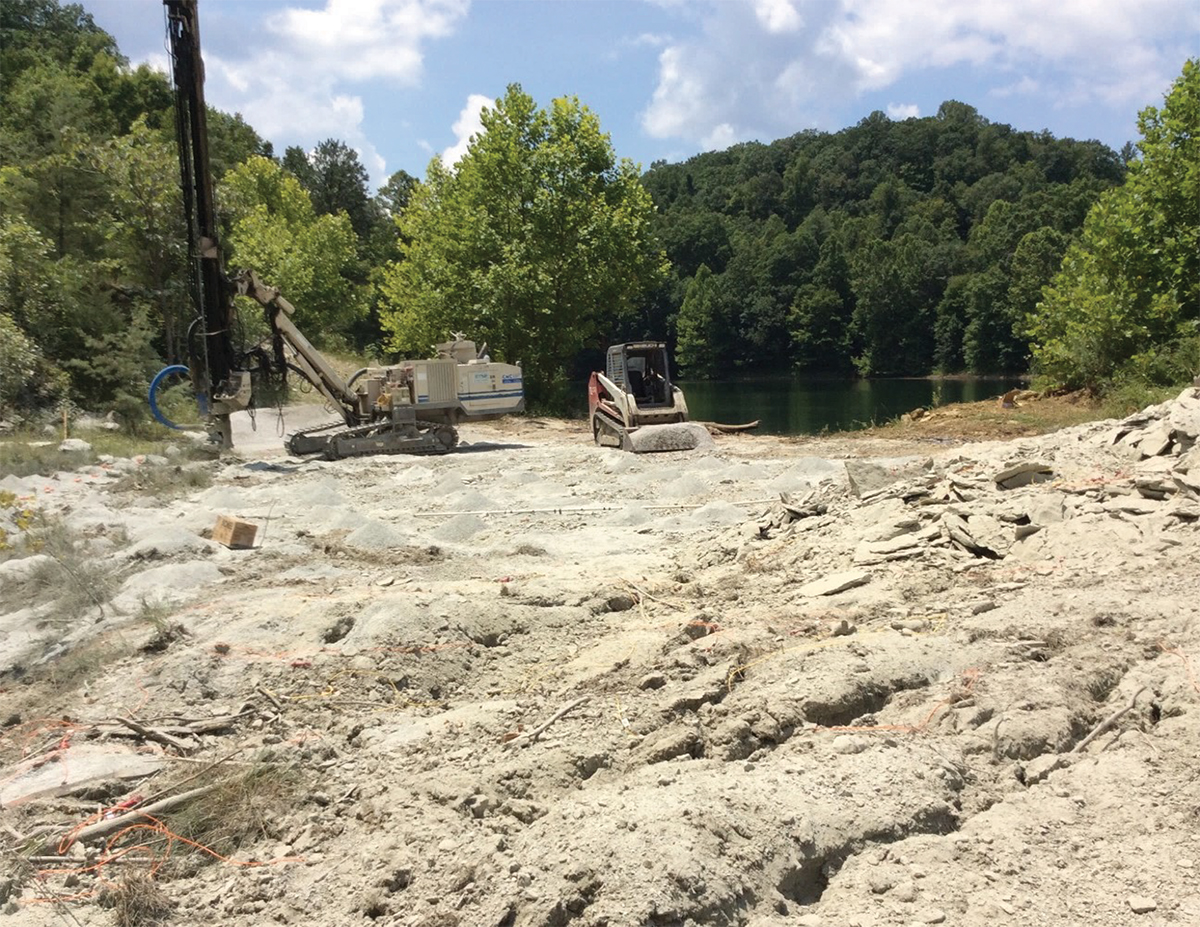• Investigate possible seepage through dam via a geotechnical survey based on the results of the geophysical survey described in item 4.2 above. Geotechnical survey will include 200 vertical feet of rock boring to locate any anomalies inside Lake Buck Dam.  Provide results of investigation along with recommended grouting locations, and assist Government in awarding grouting specialty contractor.